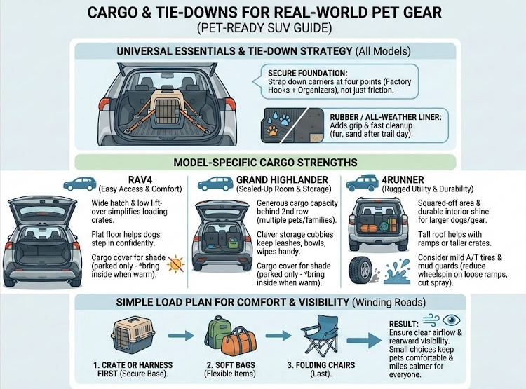 Choosing between RAV4, Grand Highlander, and 4Runner comes down to pet size, family seats, and your favorite weekends. RAV4 balances city-friendly size with a wide hatch and simple cleaning, an easy win for singles and small families. Grand Highlander offers comfort for passengers and pets when you run three rows or carry lots of gear, with cabin tech that keeps everyone content. 4Runner adds rugged materials and a boxy cargo area that works well with ramps and stacked crates. Each one can be tailored with mats and liners to match your routine.